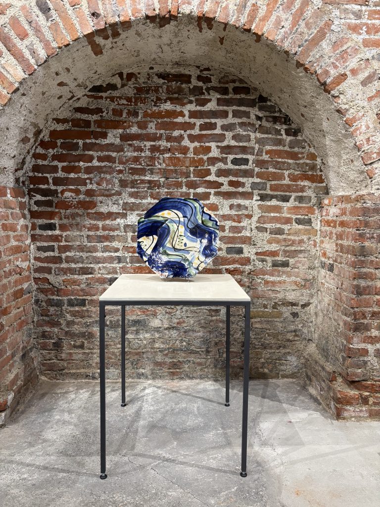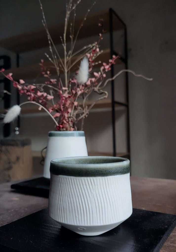 Porzellangeschirr, frei an der Scheibe gedreht. Außen mit verschiedenen Werkzeugen geschnitzt, um stellenweise einen zarten Lichteinfall zu ermöglichen. Innen mit verschiedenen Grün- und Blautönen ausglasiert. Im Holzbrand gebrannt, wodurch außen Feuer- und Aschespuren sichtbar werden.