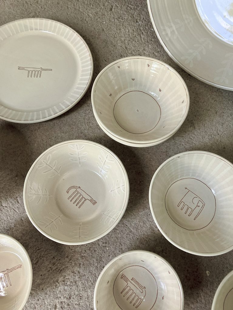 In althergebrachter Formensprache stellt Sebastian Pertl Geschirrkeramik mit Sgraffito Dekor her. Seine Motive sind mal ruhig, mal wild, mal geplant, mal intuitiv. Was wie ein Widerspruch klingt, fügt sich in seiner Arbeit zu humorvollen und harmonischen Kleinserien zusammen. Engobiert wird in rohen Zustand, darauf folgen die Ritzzeichnungen, welche im zweiten Brand mit einer transparenten Glasur versiegelt werden.